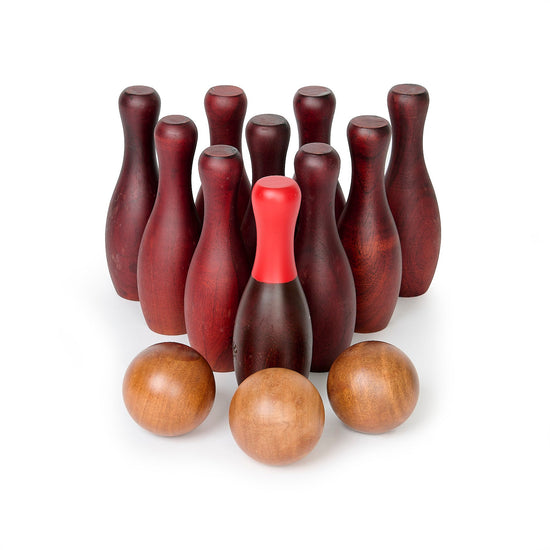 This high-quality traditional Skittles set is crafted with stained hardwood and is great to play outside but can also be played in that long hallway, the games room or on that back deck.