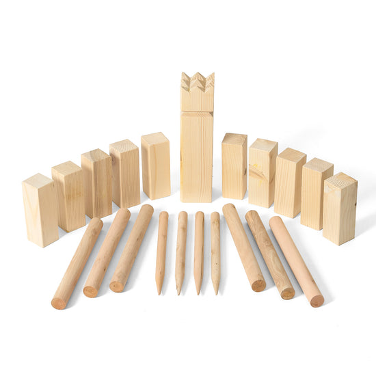 Kubb Set is a Viking tossing the Baton game; 1 King 28.6cm H; 10 Kubb Men 14 x 5.5cm; 6 Batons 28cmL X 2.8cm Diameter; 4 Corner Pegs in a carry bag